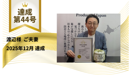 スタートはいつどこで?旅酒スタンプラリーについては2023年7月に「旅酒3番」からスタートしましたが、2017年頃からスタンプラリーに参加せずに旅酒を見つけ購入していました。 旅酒スタンプラリーに参加したきっかけは?プライベートや仕事の関係で香川県と徳島県以外の全ての都道府県に行った事がありましたし、定期的に山陰や九州へは神社詣で行っています。娘が住んでいる沖縄にも良く行くので、旅行する機会が比較的多かったのですが、目的を持たず旅に出ることが多かったので旅酒スタンプラリーは絶好の目標となりました。 心に残っている旅酒(旅行)エピソードがあれば教えて下さい。旅酒を買うことをメインに旅の行程を組み、旅の基本ですが遠方は飛行機、新幹線+レンタカー、クルマで行ける範囲は自家用車で行動しました。 「旅酒全国制覇」を達成してみて感じることは?スタンプラリーが無ければ、山口県萩市、滋賀県彦根市、四国徳島県、香川県など、一生行く機会が無かったかもしれません。訪れて大変有益な旅でした。